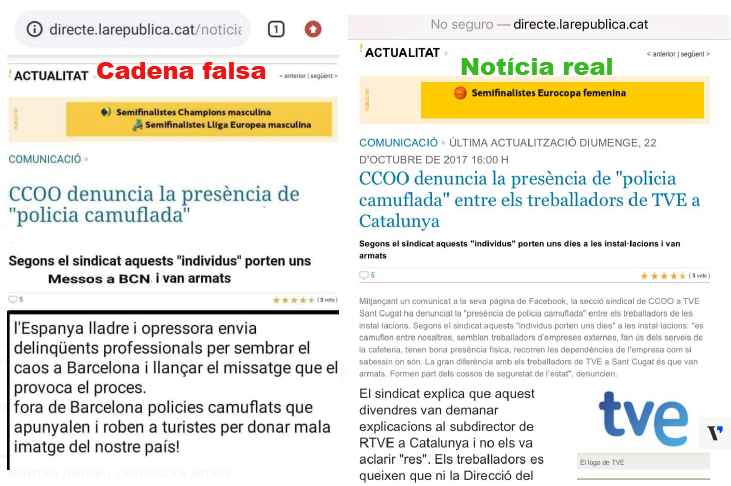 Busca les 4 diferències entre aquesta cadena falsa de WhatsApp sobre la inseguretat a Barcelona i la notícia real