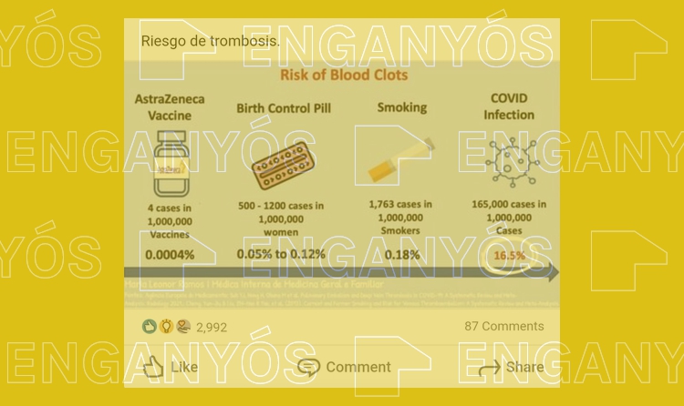 Les darreres setmanes s’ha fet viral una infografia on es compara el risc de desenvolupar coàguls de sang a causa de rebre la vacuna d’AstraZeneca/Oxford amb el risc causat pel tabaquisme, pel consum de píndoles anticonceptives i per contraure la covid-19. Es tracta d’una informació ENGANYOSA perquè la infografia compara patologies diferents i, si bé algunes de les dades citades són vertaderes, les xifres no són comparables entre elles perquè fan referència a tipus de coàguls diferents. La dada més allunyada de la realitat és la que assegura que patir coronavirus comporta un 16,5% de probabilitat de fer trombes perquè, mentre les altres xifres fan referència a la població general, aquesta és vàlida només entre els pacients hospitalitzats i per un tipus de coàguls concret.