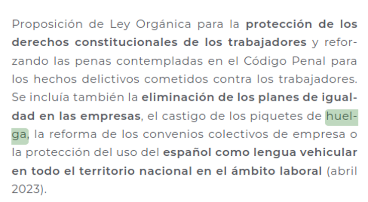 El programa de Vox per al 23J esmenta en dues ocasions les vagues en relació a prohibir els piquets, però no a prohibir les vagues en general. És en el programa del 2019 a les generals del 28-A en què Vox sí que proposava una modificació del dret a vaga.