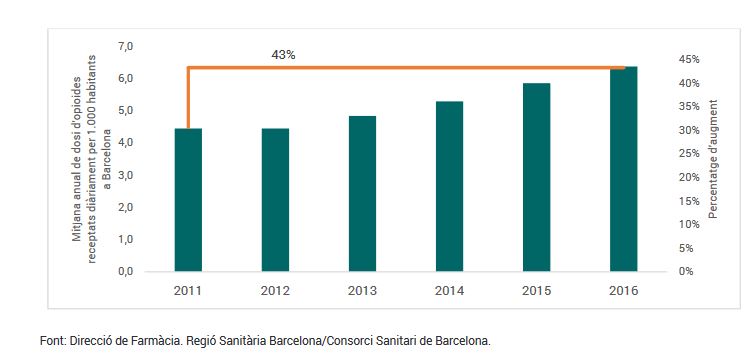 Aquest repunt també apareix reflectit en dades com les dosis d’opiacis repartides a les farmàcies de Barcelona, que ha augmentat un 43% en els darrers cinc anys.