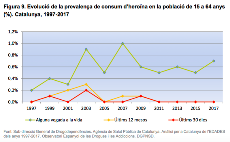 Les dades sobre consum de drogues es relacionen amb l’augment de la inseguretat a Barcelona, però no hi ha dades que demostrin que el consum d’heroïna hagi tornat als nivells dels anys 80, quan “les drogues” es van convertir en un dels principals problemes del país. L’heroïna, que es va arribar a considerar una “epidèmia”, va arribar al seu punt àlgid entre el 1991 i el 1992, amb més de 1.700 morts annuals a tota Espanya.