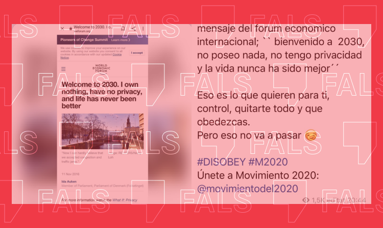 El Movimiento 2020, una agrupació que vol mobilitzar la ciutadania contra les mesures de confinament, ha publicat un missatge que inclou una captura de pantalla del web del Fòrum Econòmic Mundial amb el titular "Benvingut al 2030. No tinc res, no tinc privacitat i la vida mai ha estat millor" i ho fa servir com una suposada evidència dels plans de l’elit econòmica mundial per controlar la població. És FALS.