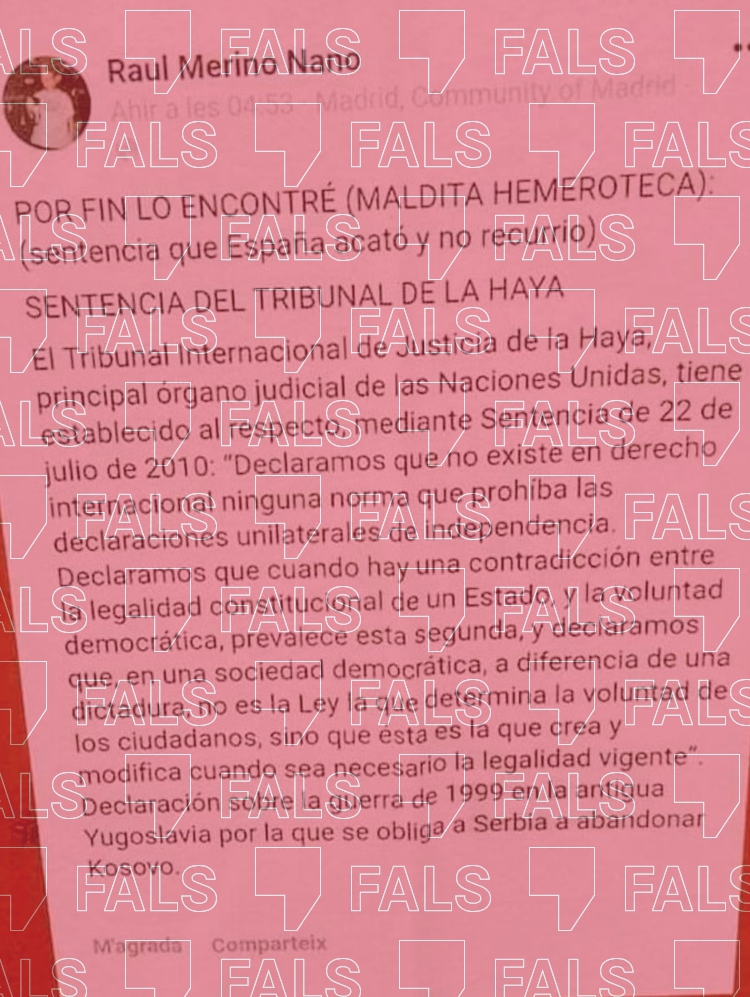 El text que adjunta Llach al seu tuit (el mateix que van citar Vidal i Rahola i que fa temps va circular per WhatsApp i Facebook) fa referència a l’opinió consultiva que va emetre la Cort Internacional de Justícia el 22 de juliol del 2010 sobre la conformitat amb el dret internacional de la declaració unilateral d’independència de Kosovo.