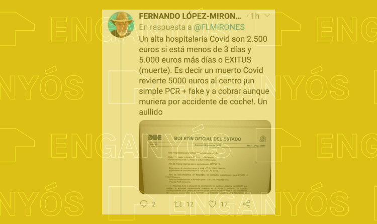 Els preus de l’Institut Català de la Salut són públics i fixes i varien lleugerament en funció de si es tracta d’un hospital de Barcelona o de fora de la capital, però sobretot depenen del tipus d’intervenció a la qual se sotmeti el pacient. A aquests preus públics, s’hi van afegir l’abril d’aquest any (el BOE ho reflectia el juny, com reprodueix la captura que ens heu enviat) unes tarifes per al tractament de pacients amb Covid-19 que preveuen, efectivament, que un ingrés inferior o igual a 72 hores es factura a 2.500 euros i un superior a tres dies o amb la mort del pacient, a 5.000.