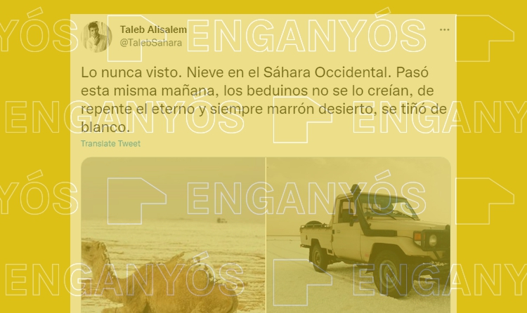 Una publicació viral a Twitter amb més de 850 retweets i 3.400 “m'agrada” assegura que va estar nevant al Sàhara Occidental durant el matí del diumenge 16 d'octubre. El post, que adjunta dues fotos com a suposades proves, és ENGANYÓS. Les condicions meteorològiques de la zona no preveien la precipitació en forma de neu, sinó que l'escenari era compatible amb la caiguda de calamarsa. De fet, les temperatures al llarg del matí i la matinada a tot el Sàhara Occidental no van baixar dels 16 ºC. A més, una recerca inversa amb Google Imatges ha revelat que una de les fotos correspon a una nevada que va passar el desembre del 2016 a l'Aràbia Saudita, mentre que l'altra il·lustra la situació posterior a la caiguda de la calamarsa.