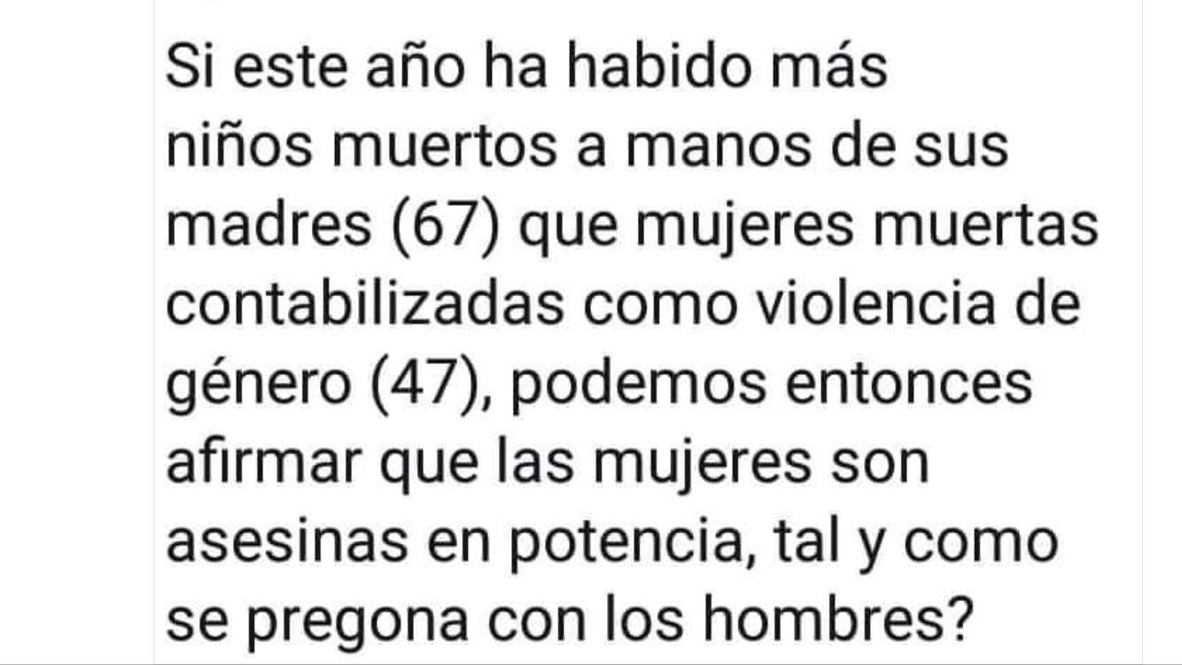 Divendres 13 de desembre van morir dues nenes de 5 i 6 anys presumptament assassinades a mans de la seva mare al municipi de Vilobí d’Onyar, pertanyent a la comarca de La Selva. A través de les xarxes socials, sobretot Facebook, es va viralitzar un missatge que ja havia circulat a principis de 2019 en el qual s’assegura que “aquest any hi ha hagut més nens morts a mans de les seves mares (67) que dones mortes comptabilitzades com a violència de gènere (47).