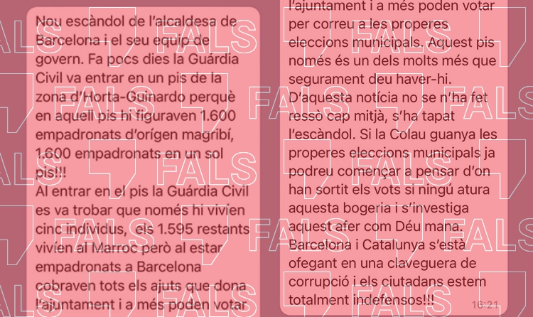 Ens heu preguntat a través del nostre servei de WhatsApp per un missatge viral que diu que “la Guàrdia Civil va entrar en un pis” a Barcelona on “hi figuraven 1.600 empadronats d’origen magrebí” que en realitat “vivien al Marroc”, però que, en “estar empadronats a Barcelona, cobraven tots els ajuts que dona l’ajuntament i, a més, poden votar per correu a les properes eleccions municipals”. El missatge insinuava que Ada Colau ho permetia per a beneficiar-se’n electoralment.