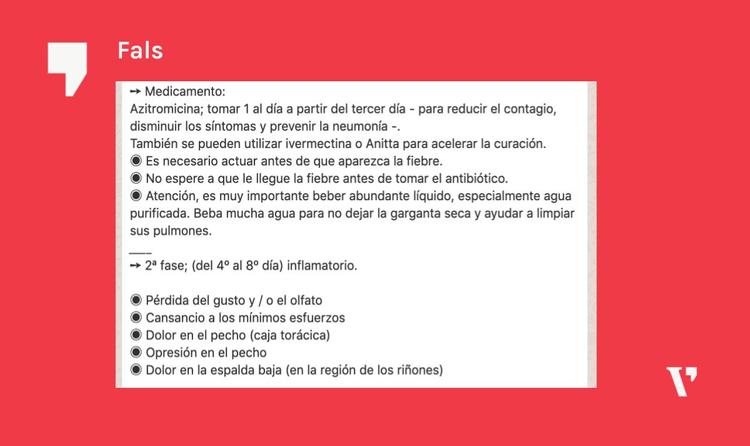 El missatge assegura literalment que l’azitromicina serveix per "reduir el contagi, disminuir els símptomes i prevenir la pneumònia", mentre que la "ivermectina o Anitta (nom comercial per nitazoxanida) es poden usar per accelerar la curació". Juan Pablo Horcajada, cap de servei de malalties infeccioses i coordinador general Covid-19 de l’Hospital del Mar, considera que "recomanar massivament aquests medicaments sense prescripció és perillós perquè pot perjudicar més a les persones, provocant efectes adversos, que no pas beneficiar-les".