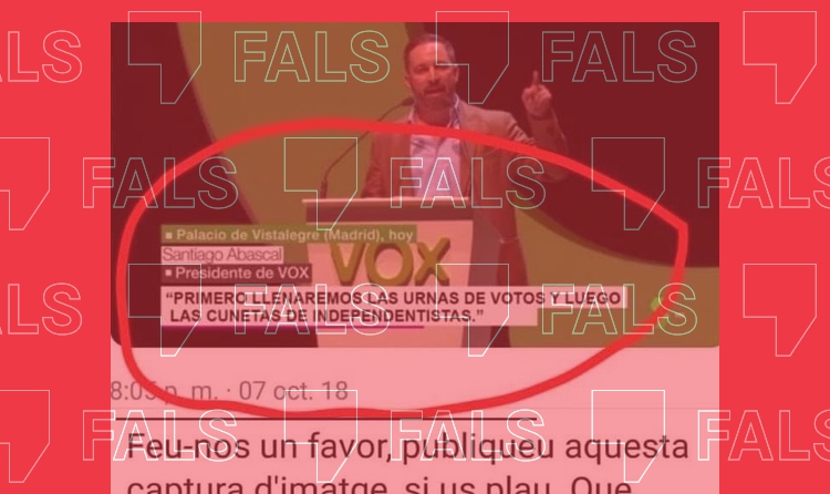 Tot i que la captura de pantalla no especifica la data en què suposadament Santiago Abascal hauria pronunciat aquestes paraules, el decorat i la roba del líder de Vox coincideixen amb les d'acte que el partit va organitzar el 7 d'octubre de 2018 al Palau de Vistalegre de la capital espanyola, com es pot comprovar al vídeo de l'esdeveniment que la formació va penjar a YouTube. Tot i això, com ha pogut comprovar Verificat i també va constatar l'equip de verificació d'AFP, el president de Vox no va pronunciar aquestes paraules en cap moment de la intervenció que va dur a terme aquell dia, la qual comença al minut 1:36:35 i acaba al 2:03:45 del vídeo.