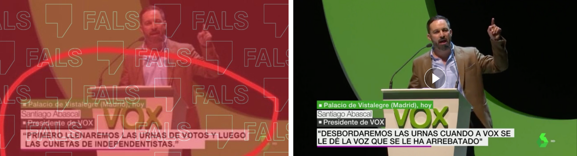 La notícia publicada a la pàgina web de La Sexta sobre l'acte de Vox celebrat al Palau de Vistalegre el 2018 tampoc no recull aquestes paraules. Al vídeo que acompanya aquesta notícia, el qual és semblant en format i imatge al de la captura de pantalla per la qual ens heu preguntat, el rètol va destacar una declaració de Santiago Abascal que no correspon a la de la imatge que ens heu enviat: "Desbordarem les urnes quan a Vox se li doni la veu que se li ha pres".