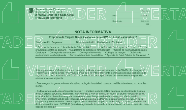 Nos habéis preguntado por la autenticidad de un documento del Servicio de Ordenación y Calidad Farmacéuticas de la Generalitat de Catalunya sobre las notificaciones de efectos secundarios adversos desconocidos de las vacunas sobre el covid-19. El Departament de Salut ha confirmado a Verificat que el documento que circula en las redes sociales y que nos habéis hecho llegar es real, que iba destinado a la comunidad médica y no al público en general y que está relacionado con el programa Targeta Groga, un sistema que recoge los efectos secundarios inesperados de todos los medicamentos.