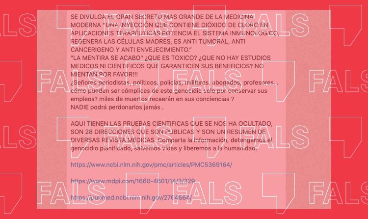 Está circulando en redes sociales un mensaje que asegura que se ha desarrollado una inyección que contiene “dióxido de cloro” con propiedades como reforzar el sistema inmune, regenerar células madre o prevenir tumores o el envejecimiento. Para justificar su afirmación, el texto adjunta 28 enlaces a supuestos estudios que defienden estas afirmaciones. Es FALSO. No existe ningún estudio revisado por pares que avale los beneficios del dióxido de cloro en humanos y los que el autor del mensaje añade o no dicen tal cosa, o no existen.