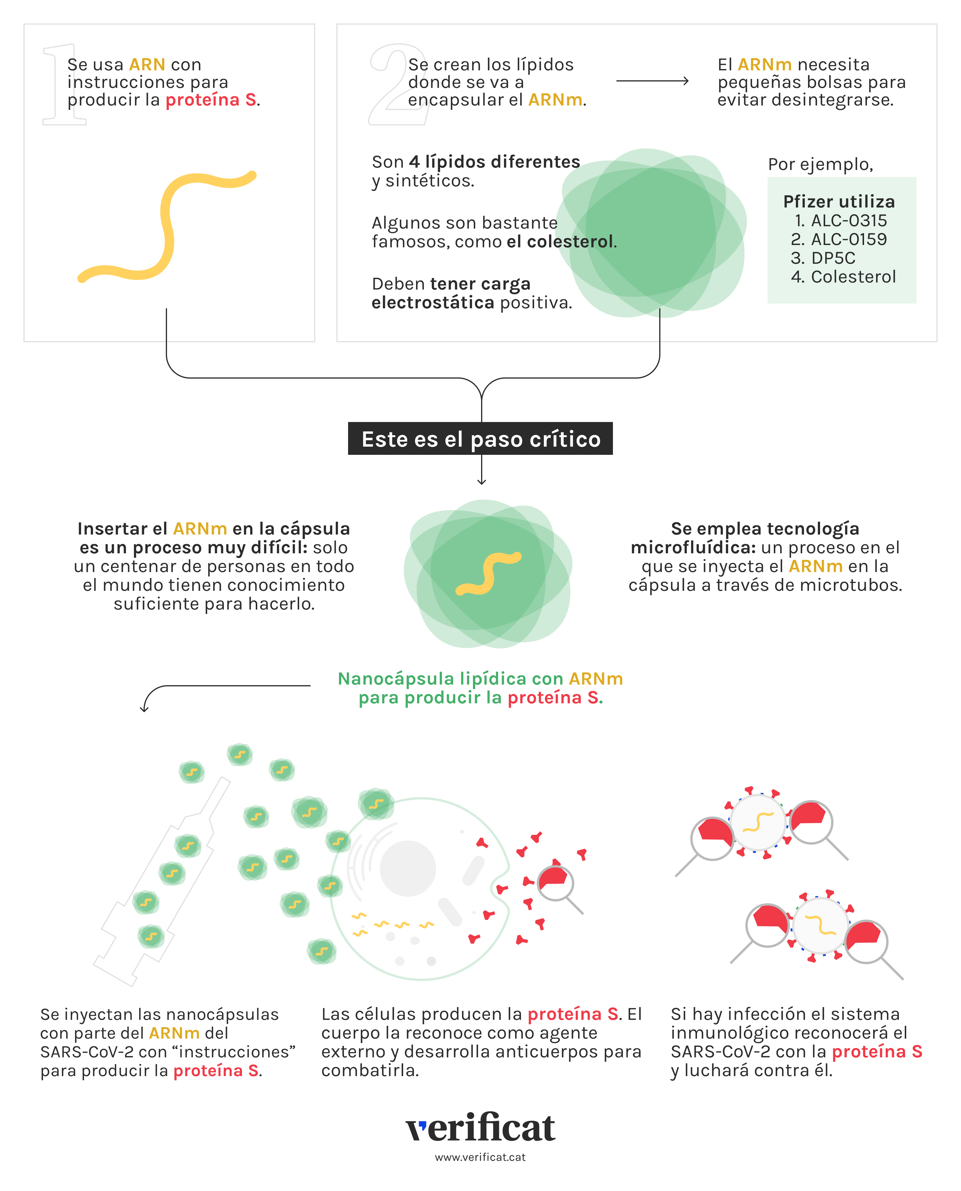 Las vacunas de ARNm no son preparados de antígenos, es verdad, pero son inyectables con ARN mensajero encapsulado en partículas lipídicas que indica a las células humanas cómo fabricar la proteína S o de espícula, es decir, el antígeno viral que pretendemos que aprenda a reconocer el sistema inmunitario. O sea, que en lugar de introducir los antígenos directamente, enseñan al cuerpo a producir la inmunidad, consiguiendo el mismo resultado que con otro tipo de estrategias.