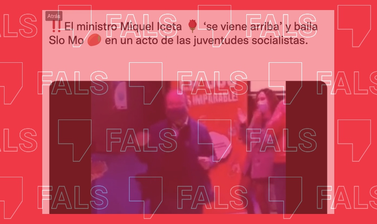 Es falso. Se trata de un montaje publicado por la JSC de L’Hospitalet. El vídeo original, en el cual se ve que la canción que realmente está bailando Iceta es Don't stop me now de Queen, corresponde a un acto de la JSC celebrado en Barcelona el 20 de noviembre de 2021 y fue publicado por la organización política juvenil en Twitter e Instagram. Así lo ha confirmado a Verificat la coordinadora de comunicación de la JSC, Andrea Gutiérrez.