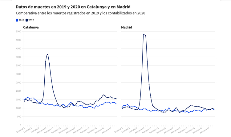 - Respecto al 2019, el aumento de las muertes en Madrid ha sido del 41,57% (18.206 fallecidos) y en Catalunya, del 28,2% (19.609).