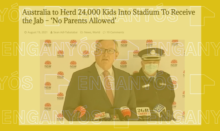 Está circulando por las redes sociales un artículo según el cual el ministro de Salud de Nueva Gales del Sur (Australia) anunciaba en una rueda de prensa que supuestamente “se llevarán a 24.000 niños en grupo a un estadio para recibir la vacuna contra la covid-19”. El autor del artículo afirmaba así que el gobierno australiano se había vuelto “completamente totalitario”. Es ENGAÑOSO. Sí, el ministro anunció su intención de habilitar un estadio para vacunar a un máximo de 24.000 jóvenes, pero no fue una iniciativa obligatoria, sino voluntaria. Por otro lado, la campaña no estaba dirigida a niños, tal y como indica el autor, sino a adolescentes de más de 16 años.