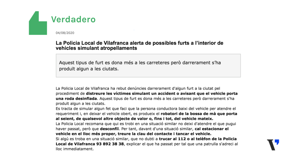 La Policía Local de Vilafranca del Penedès también ha confirmado a Verificat que sí que “es cierto que esta persona [sin dar detalles de su identidad] sufrió este tipo de robo”. Se trata de unos hechos que pasaron el 2 de agosto en el barrio de Molí d'en Rovira, una “zona con poco tráfico”. La víctima, una mujer, explicó que le habían robado el bolso que llevaba en el asiento del acompañante. Además, la Policía Local de Vilafranca cuenta que la semana pasada se produjeron otros dos robos siguiendo modus operandis similares a este; en estos casos, se fingió una avería en una gasolinera y se aprovechó la distracción para robar otro bolso, con documentación y dinero. En los tres casos las víctimas eran mujeres y las personas que fingieron la avería o el accidente eran hombres.