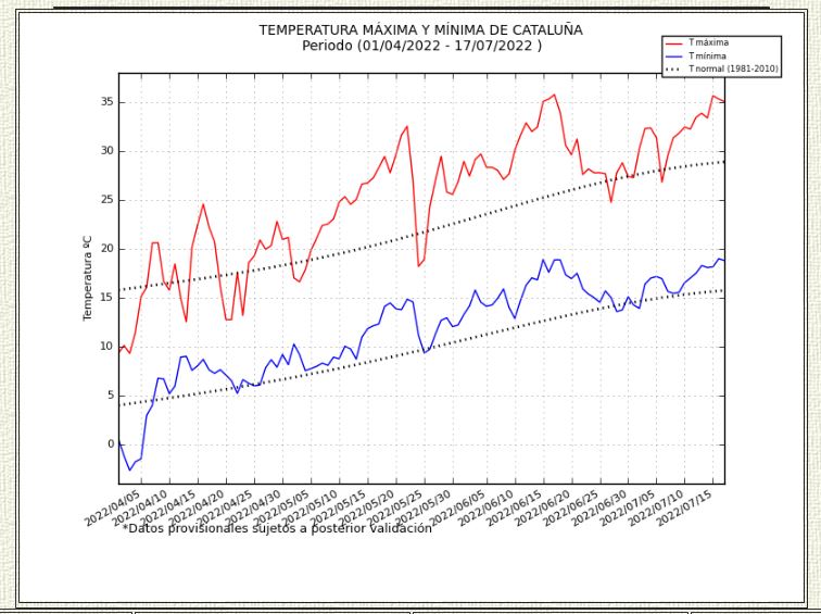 El experto adjunta un gráfico con las temperaturas máximas y mínimas —aún provisionales— entre el 1 de abril y el 17 de julio de 2022, donde se observa cómo los registros —especialmente los mínimos— están en su mayoría por encima de la media.