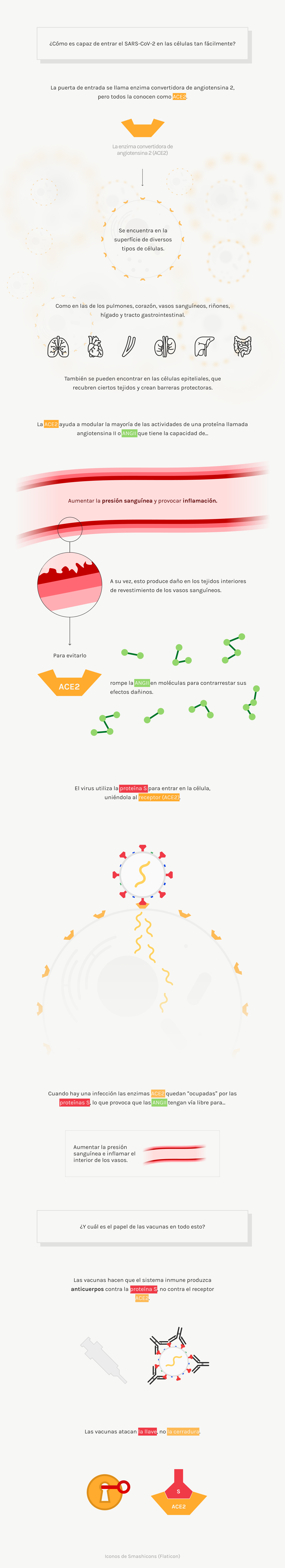 “Aunque sí puede haber algún vínculo entre la respuesta inmune que genera la vacuna y la miocarditis, el receptor de la angiotensina-2 (ACE2) no tiene nada que ver”, asegura el experto. “Las vacunas producen anticuerpos contra la proteína S, no contra el receptor de ACE. Es decir, atacan a la llave, y no a la cerradura”, concluye.