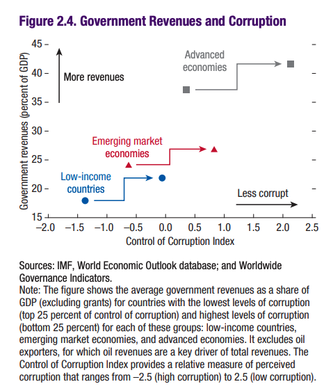 Este estudio determina que “los ingresos gubernamentales [impuestos] son significativamente menores en los países percibidos como más corruptos”. El análisis se ha hecho según el “ranking de control de la corrupción” del Banco Mundial, un indicador agregado que “captura percepciones de hasta qué punto el poder público se ejerce en beneficio privado, incluidas formas tan pequeñas como grandes de corrupción, así como la “captura” del Estado por parte de las élites y los intereses privados”. Este indicador combina datos y percepciones de más de 30 fuentes sobre la corrupción política, la corrupción empresarial y la transparencia existente al respecto —entre otros factores—.
