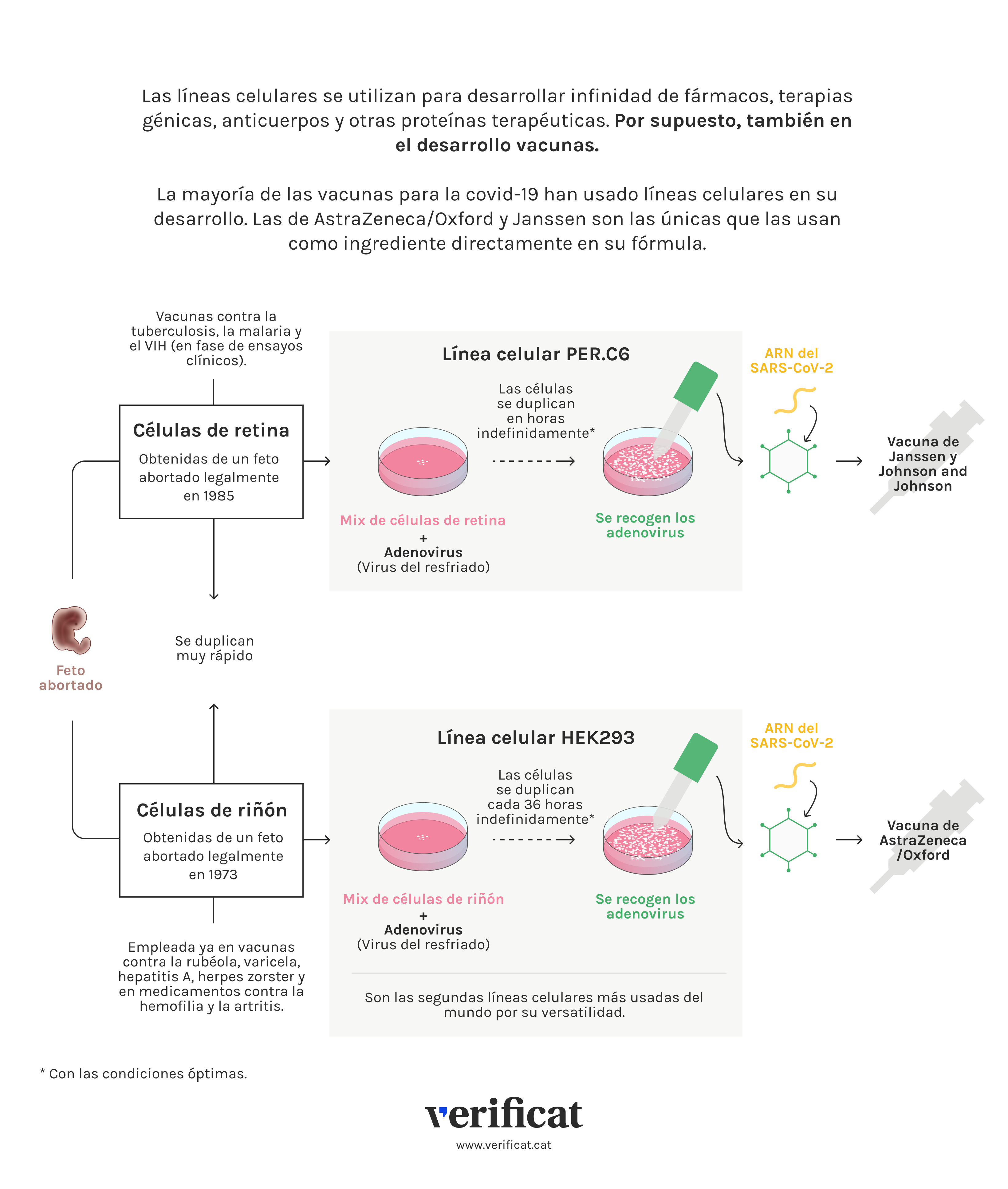 En el contexto del SARS-CoV-2, Pfizer/BioNTech, Moderna y AstraZeneca/Oxford han fabricado vacunas contra la covid-19 empleando la línea celular conocida como HEK 293, creada a partir de células de riñón extraídas de un feto abortado legalmente en 1973. Janssen, por su parte, utiliza la línea celular PER.C6, que tiene patentada y que proviene de células de retina de un feto abortado legalmente en 1985
