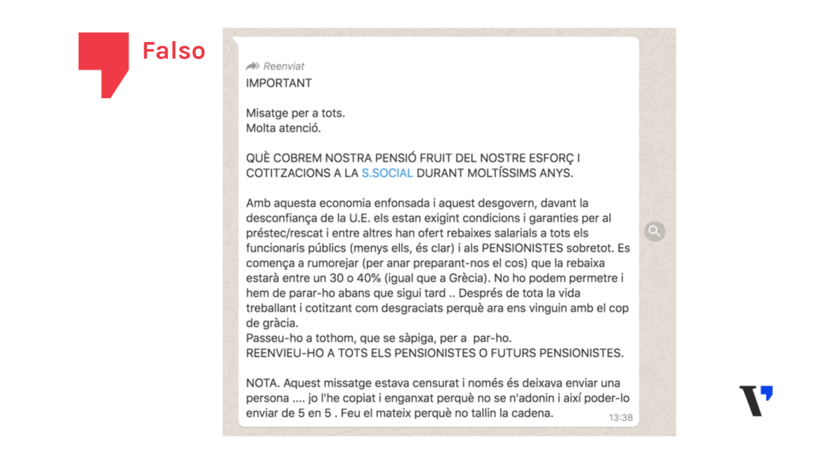 Para acabar, el mensaje también hace la comparación con la rebaja de las pensiones que hubo en Grecia. Es verdad que durante la crisis las pensiones se redujeron entre un 20% y un 40%, pero el economista experto en pensiones José Antonio Herce relata que Grecia hizo en poco tiempo doce reformas de las pensiones que supusieron los recortes, pero “no negoció su rescate comprometiéndose a rebajar las pensiones un 30%”. Fue una rebaja progresiva.