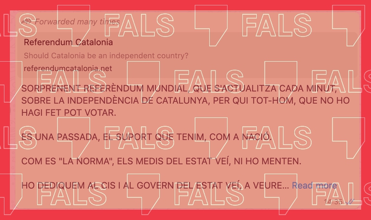 Nos habéis hecho llegar por WhatsApp (al 666 90 83 53) un mensaje que habla de un “sorprendente referéndum mundial sobre la independencia de Catalunya que se actualiza cada minuto” y que destaca “el apoyo que tenemos como nación”. En el mensaje viene un enlace a una encuesta en línea: referendumcatalonia.net.