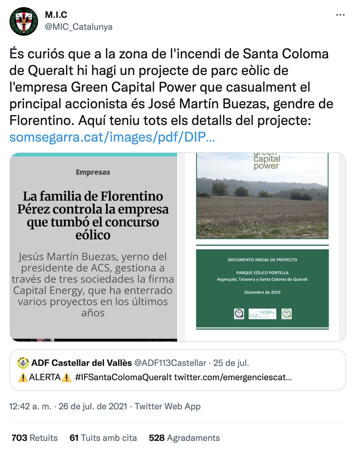A finales de julio, los Bomberos de la Generalitat controlaron el incendio que ardía desde hacía días en la Conca de Barberà y Anoia, cerca del municipio de Santa Coloma de Queralt. En Twitter, algunos usuarios insinuaron que la empresa Green Capital Power estaba detrás del origen del incendio, ya que tenía un parque eólico proyectado en esa zona, y nos habéis preguntado qué sabemos.
