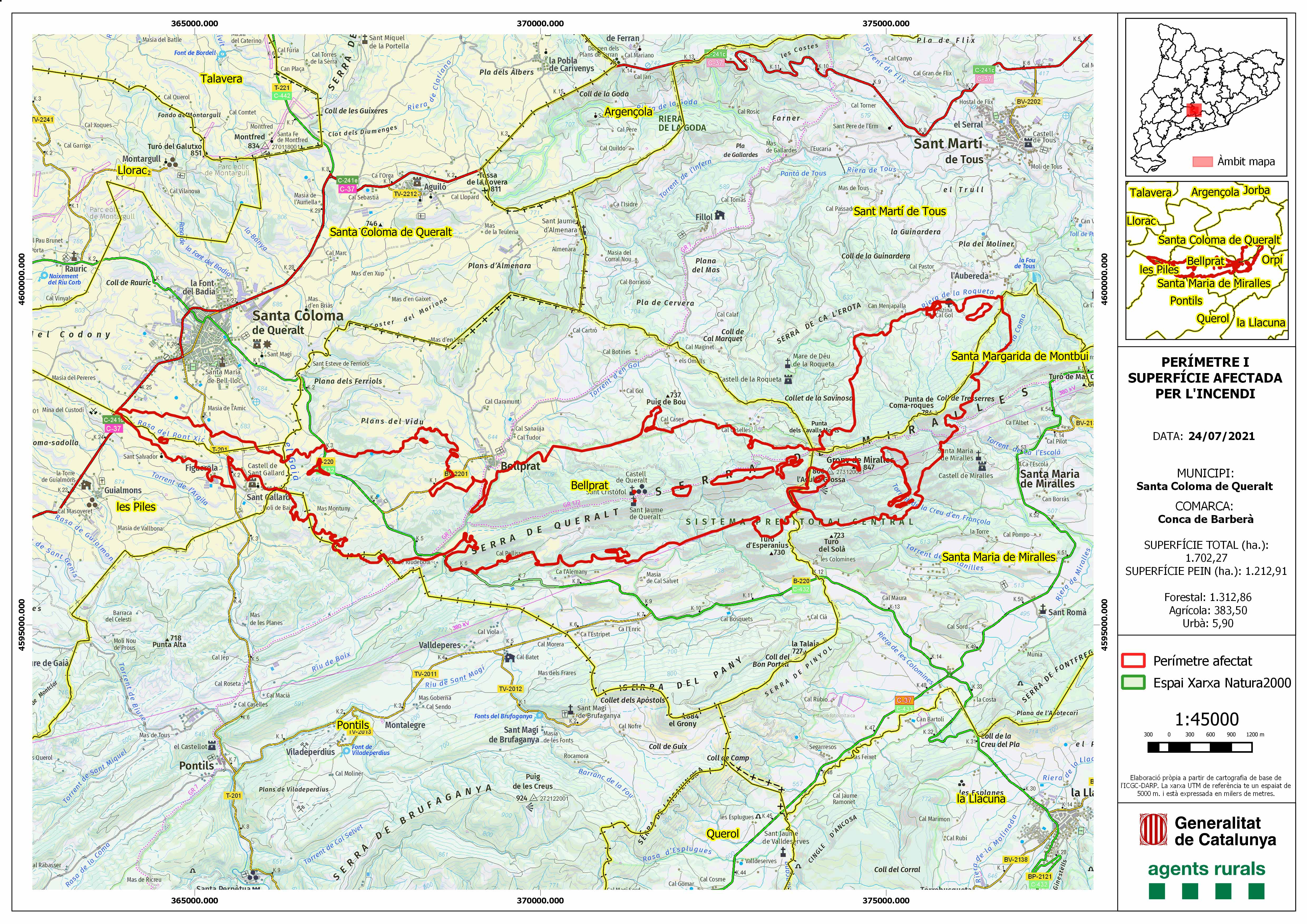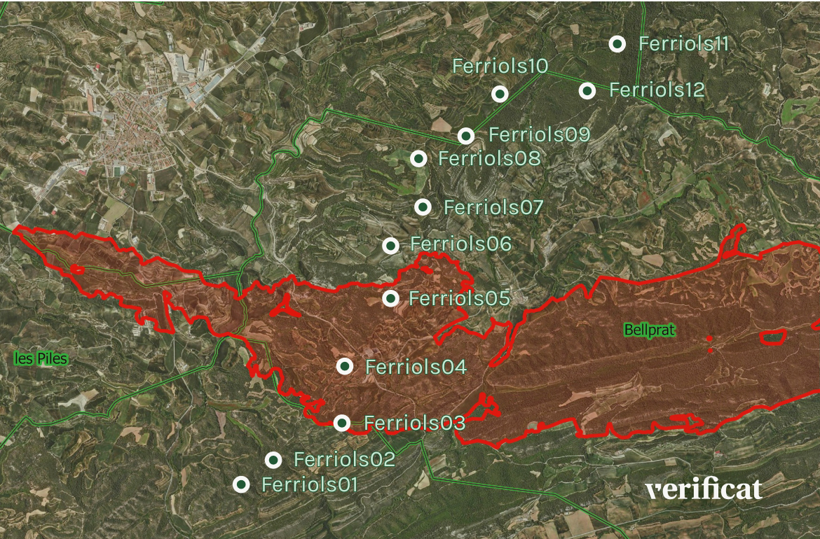 Finalmente, el Parque Eólico Ferriols, formado por doce aerogeneradores, numerados del 1 al 12 en el visor ambiental, sí coincide, en parte, con la superficie quemada en el incendio de Santa Coloma de Queralt, mostrada en el mapa de los Agentes Rurales: