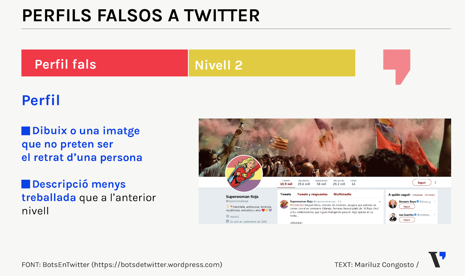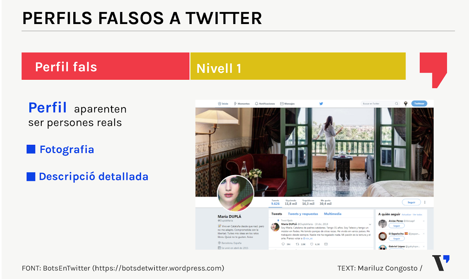 Nivell 1. Són els perfils falsos més elaborats i simulen comptes de persones reals. Són també els més cars. L’usuari s’identifica amb noms i cognoms, inclou una descripció al seu perfil i fa servir una fotografia real, que segurament ha comprat a Internet.
