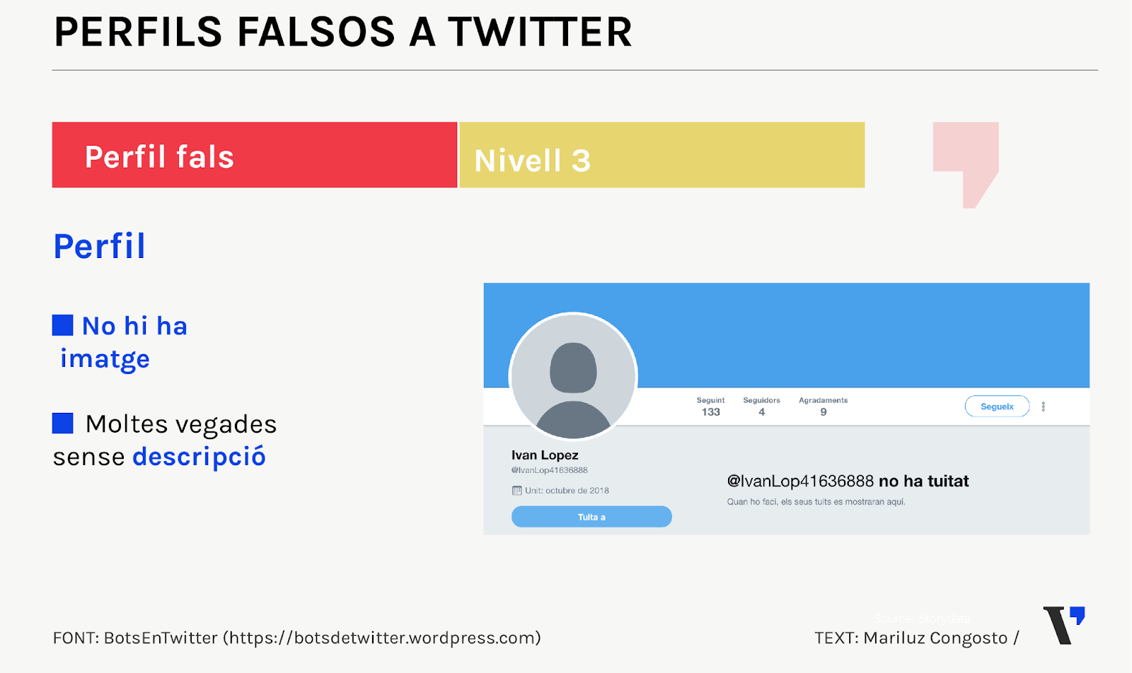 Nivell 3. Són els perfils falsos menys elaborats i, conseqüentment, els més econòmics. No tenen ni fotografia, ni descripció i en el nom d’usuari acostumen a aparèixer lletres i números.