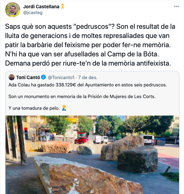 L’espai de memòria de la Presó de Dones de les Corts , inaugurat ara fa un any, genera aquests dies polèmica a Twitter. Hem recollit una sèrie de missatges que en qüestionen la qualitat artística i, sobretot, el cost per a l’erari públic. En concret, es diu que col·locar cinc pedres al carrer ha tingut un cost de 338.000 euros i això és ENGANYÓS.