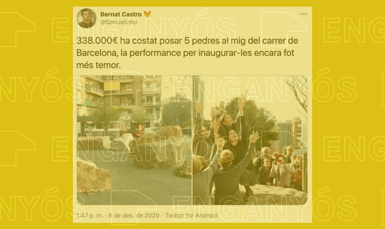 L’espai de memòria de la Presó de Dones de les Corts , inaugurat ara fa un any, genera aquests dies polèmica a Twitter. Hem recollit una sèrie de missatges que en qüestionen la qualitat artística i, sobretot, el cost per a l’erari públic. En concret, es diu que col·locar cinc pedres al carrer ha tingut un cost de 338.000 euros i això és ENGANYÓS.