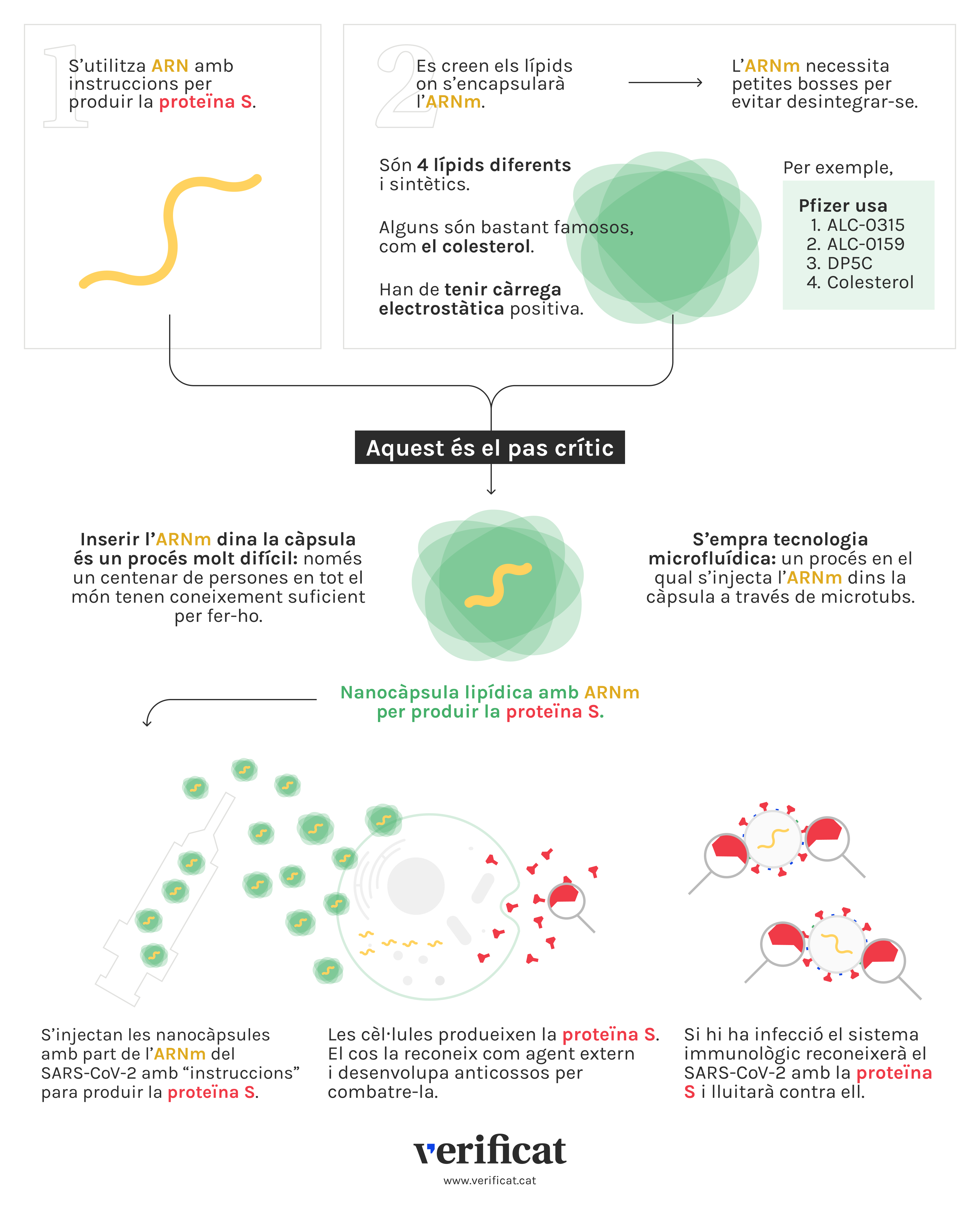 Aquest tipus de vacunes no modifiquen el codi genètic de qui les rep, com ja hem explicat. Els vials d'ARNm, com el de Pfizer o el de Moderna, estan fets d'un fragment de codi genètic del coronavirus, que s'incorpora a una càpsula lipídica que el transporta fins a les cèl·lules. Aquí, desencadena una resposta immune dins el cos que, en el moment d'entrar en contacte amb el SARS-CoV-2, pot combatre'l i evitar així cursar els quadres més greus de la malaltia. No obstant això, tal com indiquen des de la web de l'Aliança per la Vacunació (GAVI, en anglès), aquestes vacunes no són capaces d'alterar el nostre ADN perquè, primer, “ARN no és el mateix que ADN”, i segon, perquè aquest ARN “no es pot combinar amb el nostre ADN per canviar el nostre codi genètic”. A més, l'ARN “és molt fràgil (d'aquí ve que necessiti ser transportat per aquestes nanopartícules de greix fins a la cèl·lula), i es mantindrà a l'interior de la cèl·lula 72 hores abans no es degradi”.