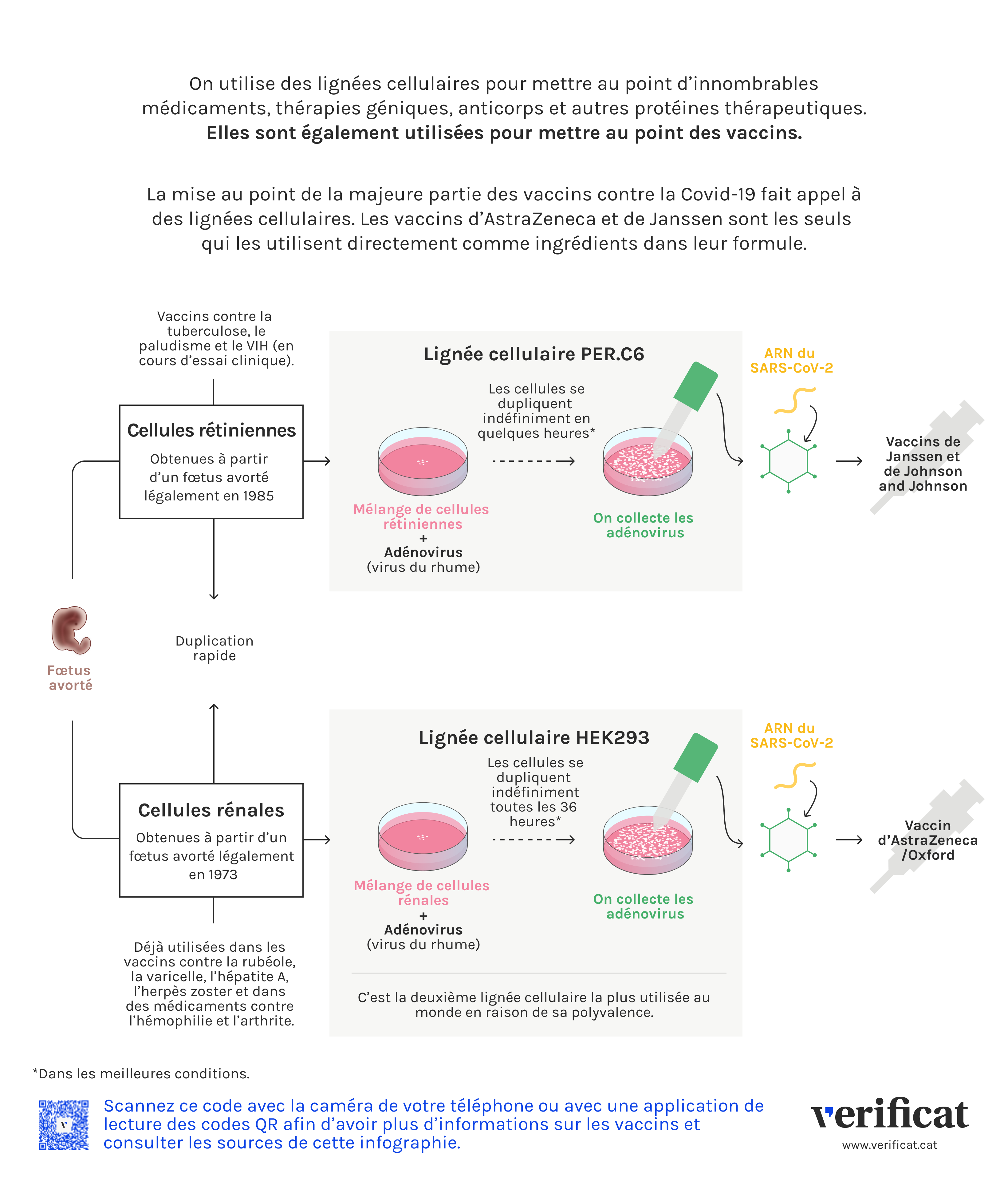 Par conséquent, les vaccins contre la Covid-19 ne sont pas fabriqués avec des cellules provenant directement de fœtus humains avortés, mais avec des cellules créées par des scientifiques il y a près de 50 ans et qui se reproduisent continuellement en laboratoire.