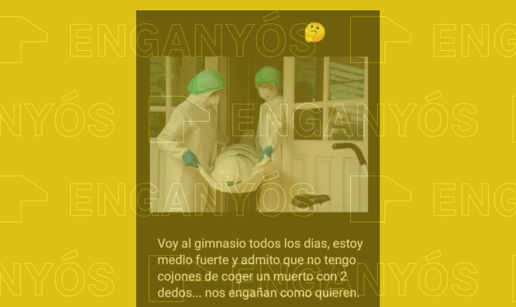 Ens heu fet arribar per WhatsApp una imatge en què es veuen dues persones vestides amb equips de protecció individual (EPI) traient d’una habitació el suposat cadàver d’una persona que hauria mort per Covid-19. La imatge l’acompanya un text que diu "voy al gimnasio todos los días, estoy medio fuerte y admito que no tengo cojones de coger un muerto con 2 dedos… nos engañan como quieren", fent referència al fet que les persones amb EPI sembla que treguin el cos de l’habitació fent servir només "dos dits". La fotografia que apareix a la composició és una imatge d’estoc elaborada amb finalitats comercials, però la interpretació que se’n fa des del text és enganyosa, perquè suggereix que pretén transmetre una realitat falsa.
