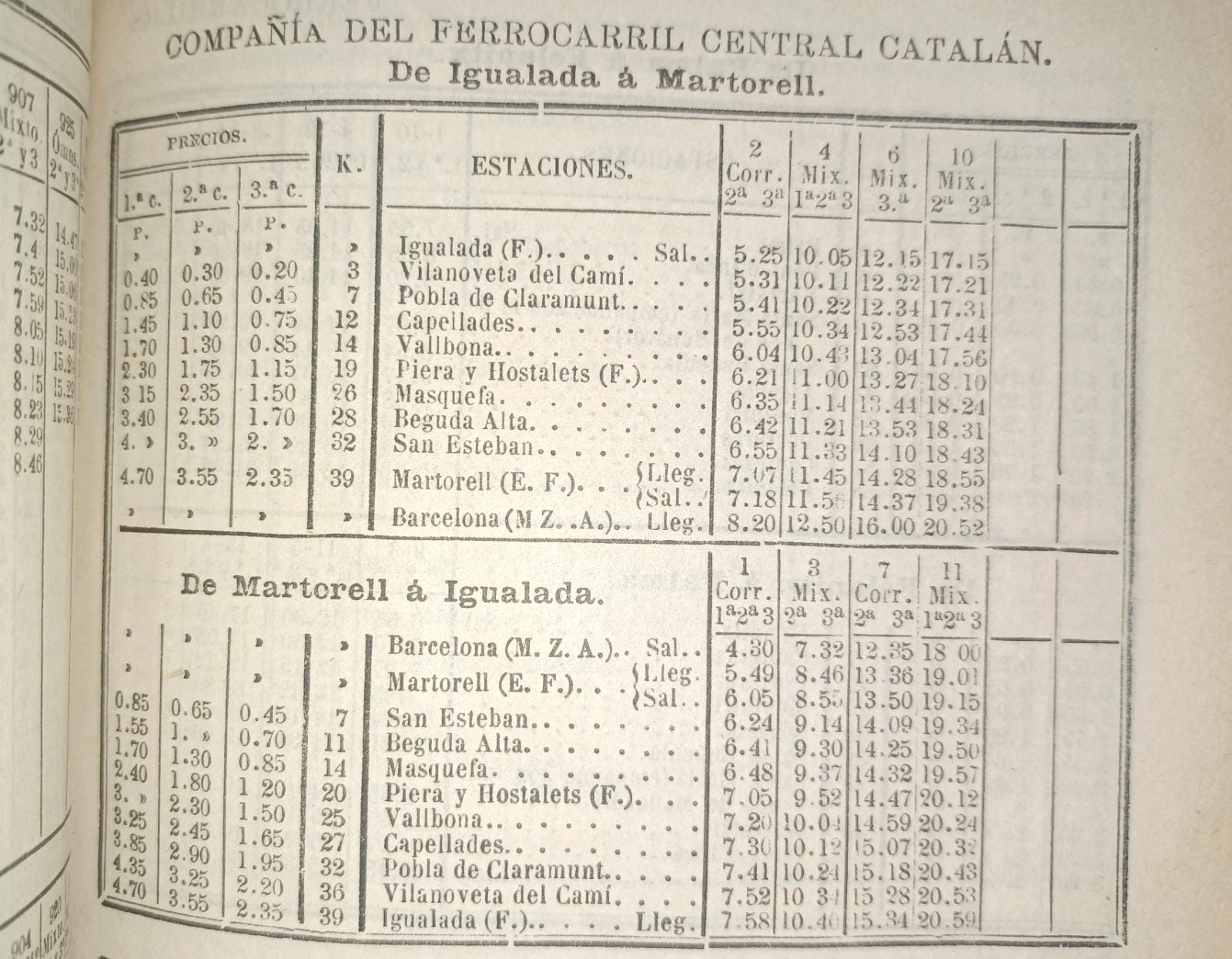 A la primera dècada del segle XX, quan els passatgers que volien traslladar-se des d'Igualada fins a Barcelona es veien obligats a fer transbord a Martorell, el trajecte fins a la capital catalana durava entre dues hores i 34 minuts i tres hores i 36 minuts, en funció de l'horari de sortida i restant el temps d'espera del transbordament. Així ho indiquen els horaris de la dècada del 1900 que ha facilitat a Verificat el director del Centre d'Estudis del Transport, Joan Carles Salmerón. Actualment, el trajecte d'Igualada a Barcelona fa servir entre una hora i 24 minuts i una hora i 37 minuts, segons els horaris laborables de la línia publicats al web de Ferrocarrils de la Generalitat de Catalunya.
