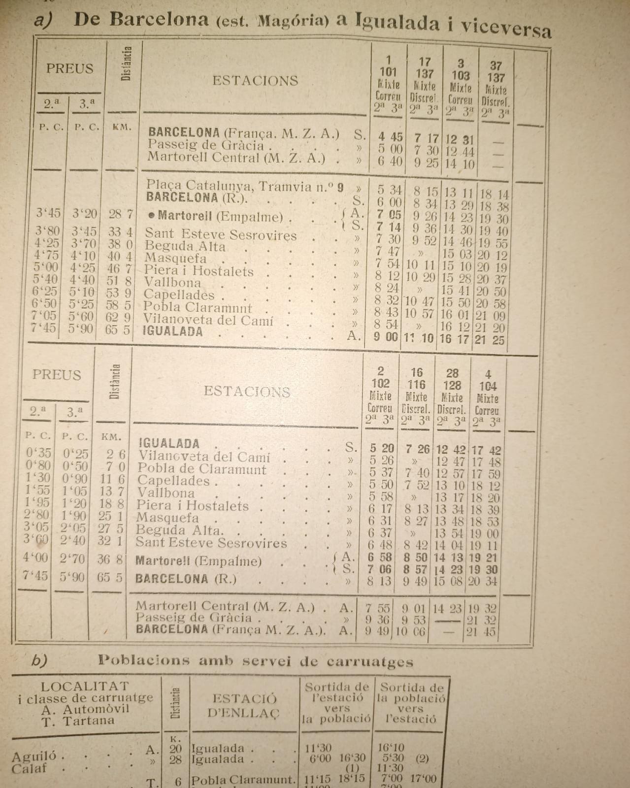 Horaris de la línia de ferrocarril Igualada-Barcelona a la dècada de 1920. Font: Joan Carles Salmerón i Fernández (Terminus Centre d'Estudis del Transport).
