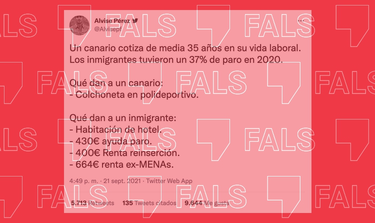 Alvise Pérez, un compte amb més de 260 mil seguidors a Twitter ha compartit un missatge amb informació falsa comparant les ajudes que rep un canari (donant a entendre que amb nacionalitat espanyola) i les que percep un immigrant. Tot i que no fa referència explícita a la situació jurídica d’aquestes persones estrangeres, sí que remet a una mesura temporal per allotjar en hotels buits per la pandèmia del coronavirus algunes de les persones que havien arribat en pastera durant una onada migratòria a finals del 2020, quan les arribades van augmentar en un 1.000% respecte a l’any anterior.