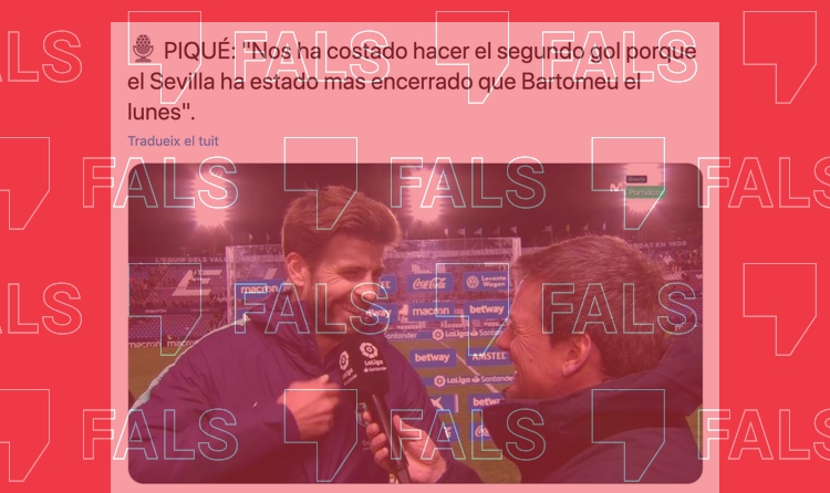 En les últimes hores, ens heu fet arribar per WhatsApp, i han circulat molt per Twitter i per Facebook, unes suposades declaracions del futbolista del Barça Gerard Piqué en les quals se li atribueix haver dit que el Sevilla va estar “més tancat que Bartomeu el dilluns”. La frase està circulant en molts casos com mem o diversió, però també hi ha publicacions que les estan compartint com si fossin certes. No obstant això, es tracta de declaracions falses. Piqué no va parlar en roda de premsa després del partit del 3 de març de la Copa del Rei, no va fer aquestes declaracions per altres mitjans i la foto que s'adjunta és de 2018. Únicament ha publicat un tuit celebrant la victòria del seu equip.