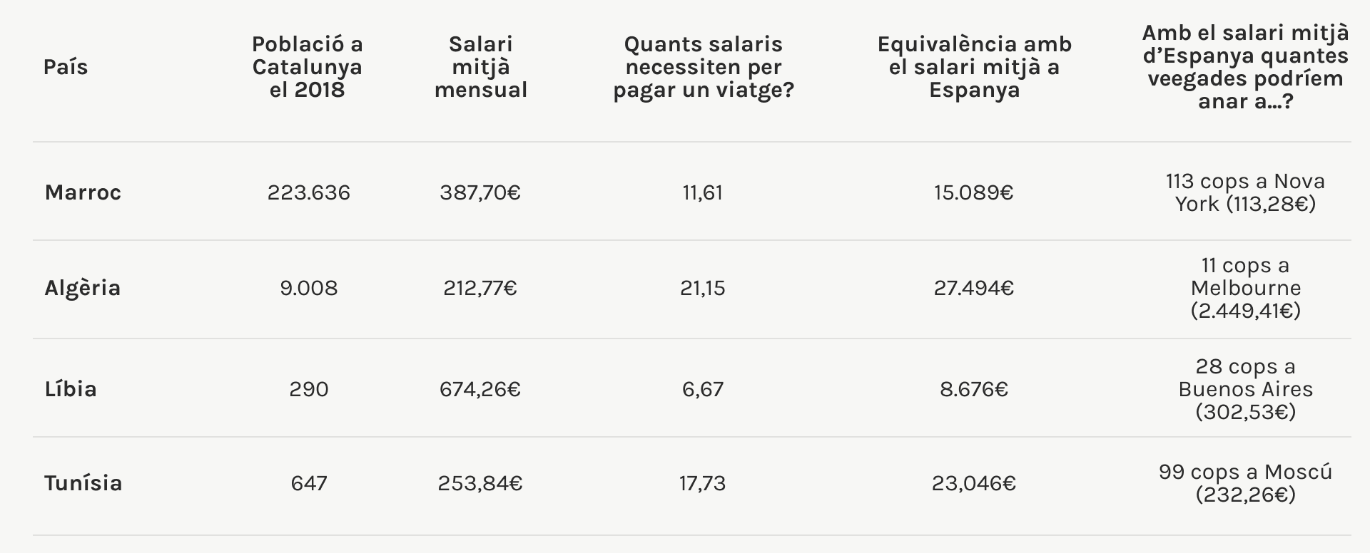 Segons dades d’Europol, el 2015, els migrants que arribaven a l’espai Schengen per a la via del Mediterrani pagaven 4.500 euros cadascun pel viatge, “destinats a organitzacions criminals de contrabandistes i traficants”. Si comparem aquest preu amb el salari mitjà dels quatre països africans més propers a Espanya que tenen sortida al Mediterrani, veiem que una persona del Marroc ha d’invertir més d’onze salaris (agafant de referència el sou mitjà) per arribar a la península ibèrica de manera il·legal. On es podria arribar amb el sou base a Espanya (de gairebé 1.000 euros)?