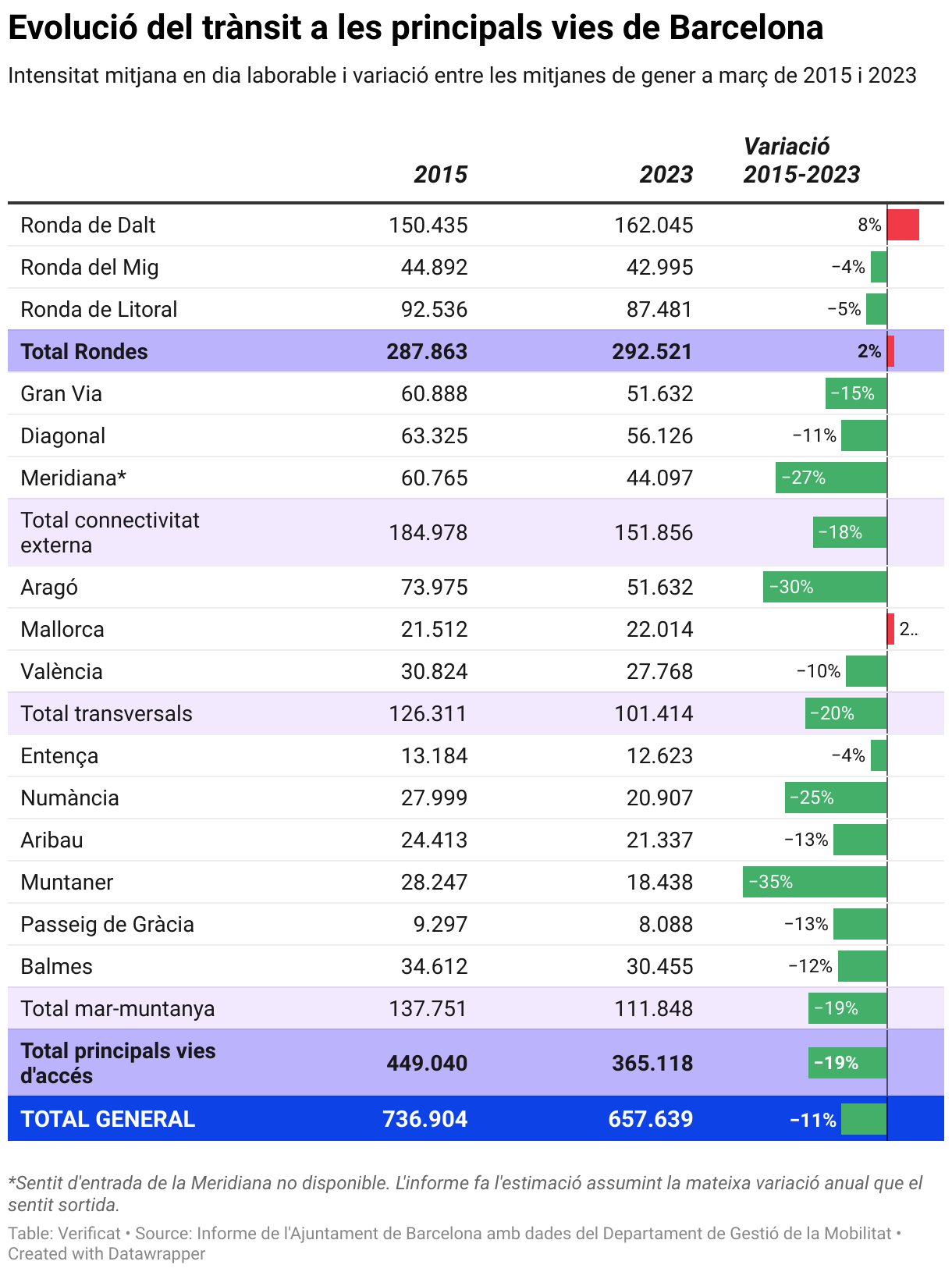 A més curt termini, per 2023, l’estudi va concloure que el carrer de València assumiria 8.000 vehicles diaris més que habitualment, una dada que no coincideix amb els primers informes publicats de l’Ajuntament sobre la transformació d’aquests carrers. “Entre els anys 2017 i 2022, la intensitat mitjana en dia feiner a l’àmbit de l’Eixample Central s’ha reduït un 17%”, apunta l’estudi Evolució del trànsit motoritzat a l’Eixample i a les principals vies d’accés a la ciutat 2015-2023, publicat l’abril d'aquest any. El treball també mostra que el nombre de vehicles per hora que circula pel carrer València s’ha reduït un 10% entre el 2019 i febrer del 2023. L’única via analitzada de l’Eixample on ha augmentat la intensitat del trànsit és el carrer de Mallorca, amb un increment del 2%.