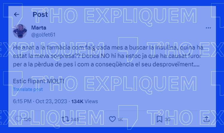 Una versió anterior del text atorgava el veredicte de fals a la piulada sobre el desabastiment d’insulina a les farmàcies, i asseverava que no hi havia problemes de subministrament a les farmàcies. L’hem canviat a t’ho expliquem, donat que l’Agència Espanyola de Medicaments i Productes Sanitaris (AEMPS), té actiu un avís de problema de subministrament de la insulina Fiasp 100 unitats/ml, amb data prevista d’inici el 20 d’octubre de 2023, prèvia a la publicació de l’article.