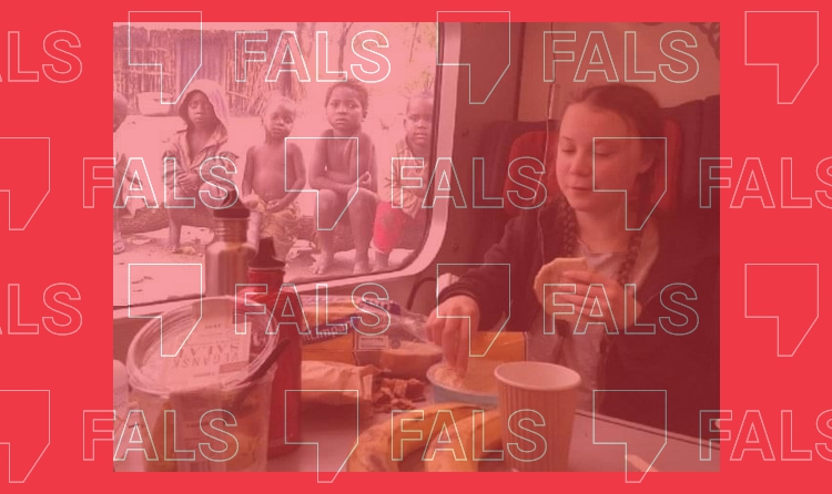 Més enllà de la piulada d’El Puntual 24H, altres usuaris han compartit la falsa declaració de Greta Thunberg juntament amb una imatge que mostra l’activista menjant asseguda en un tren i un grup d’infants africans a fora del vagó. És FALSA.