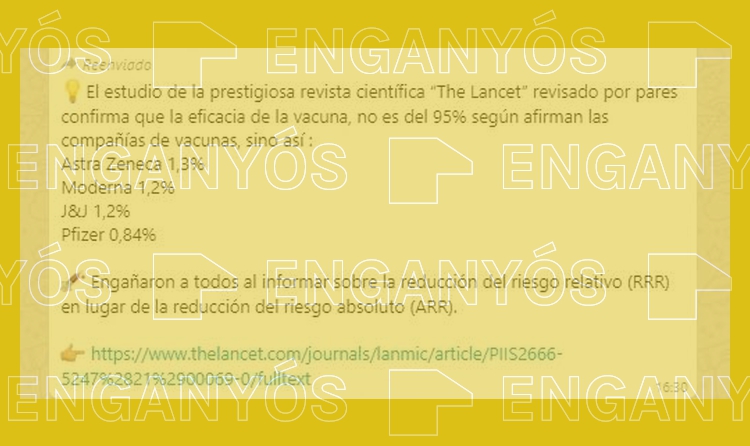 El missatge afirma que el comentari de The Lancet indica que l'eficàcia de les vacunes “no és del 95%, segons afirmen les companyies”, sinó del 1,3% en el cas de AstraZeneca, 1,2% en el de Moderna i J&J, i del 0,84% en el cas de Pfizer. Tant les xifres oficials com les que menciona el comentari són correctes i complementàries, donat que corresponen a diferents maneres de mesurar l'eficàcia de les vacunes. L'eficàcia del 95% correspon, efectivament, a les xifres que les autoritats han anat fent públiques sobre les diferents vacunes. Aquesta manera de mesurar l'eficàcia es diu reducció del risc relatiu (RRR) i és correcta, però hi ha una altra manera d'entendre l'eficàcia d'una vacuna, i és a través la reducció del risc absolut (ARR), que en comptes de tenir només en compte l'individu, com passa amb la RRR, considera també el conjunt de la població. “La RRR hauria de ser analitzada en comparació amb el risc de ser infectat i contreure la covid-19, la qual cosa varia en funció de les poblacions i del temps”, diu el text de The Lancet. Aquesta combinació entre l'eficàcia de la vacuna i la situació epidemiològica dóna la ARR.