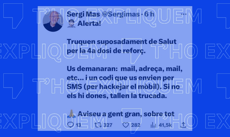 Ens heu preguntat per una publicació del periodista Sergi Mas a X, la xarxa social abans coneguda com a Twitter, en la qual denuncia un suposat intent de hackeig d’algú que truca “suposadament de Salut per la 4a dosi de reforç”, demanant dades personals i “un codi que us envien per SMS”, que s’empraria per a piratejar el dispositiu. També ens heu preguntat per un missatge de WhatsApp “reenviat moltes vegades” que denuncia la mateixa praxi d’algú que es fa passar pel “Ministeri de Salut”.