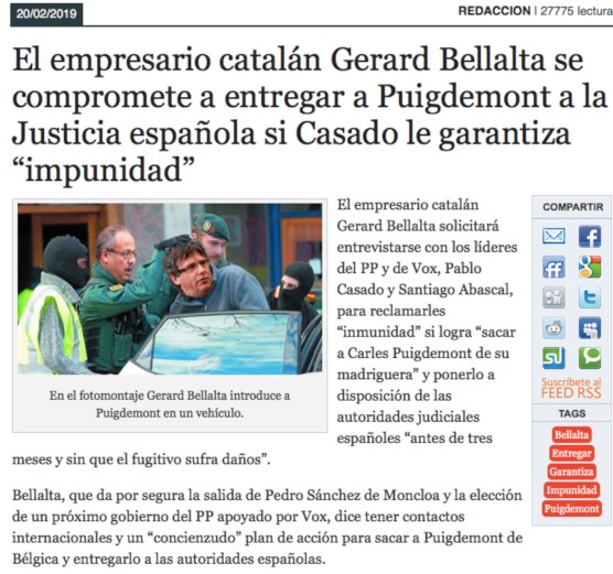 "L’empresari català Gerard Bellalta sol·licitarà entrevistar-se amb els líders del PP i Vox, Pablo Casado i Santiago Abascal, per reclamar-los "immunitat" si aconsegueix "treure Carles Puigdemont del seu cau" i posar-lo a disposició de les autoritats judicials espanyoles ‘abans de tres mesos i sense que el fugitiu pateixi danys’”, diu el text d’Alerta Digital.